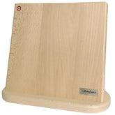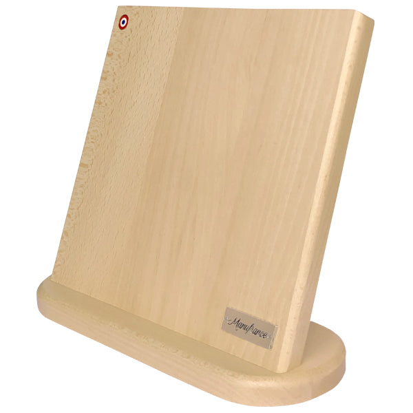 Ne vous est-il jamais arrivé de passer de longues minutes à rechercher au fond d'un tiroir le couteau dont vous aviez besoin pour votre recette ? Pour mettre fin à ce problème agaçant et qui peut s'avérer dangereux (risque de coupure) le porte-couteaux Manufrance fabriqué en hêtre et verni est la solution idéale. Il peut accueillir jusqu'à 4 couteaux à découper. Fini la perte de temps, vos couteaux sont toujours sous vos yeux et à portée de la main faciles à saisir sans danger. Il suffit de les plaquer sur la planche en bois légèrement inclinés et ils sont fermement maintenus grâce aux puissants aimants se trouvant au verso. Une solution de rangement rapide, pratique, sure et hygiénique. Ainsi disposés ils ne craignent plus de s'abimer, s'émousser ou même rouiller. Contrairement aux porte-couteaux dans lesquels vous insérez les lames dans un logement prévu à cet effet, sur ce modèle aimanté les lames restent bien visibles, vous préservez ainsi leurs tranchants. Sa large base lui assure une stabilité parfaite pour un usage en toute sécurité et la puissance des aimants empêche tout risque de chute. Enfin c'est aussi un splendide objet décoratif qui se fera admirer en trouvant facilement sa place que ce soit dans votre cuisine, sur une table, un buffet ou sur un plan de travail. Il s'intégrera parfaitement dans des intérieurs au style moderne. Le porte-couteaux Manufrance est fabriqué en France, dans des ateliers traditionnels au cœur du département du Puy de Dôme, terre d'artisanat. A ce titre il arbore fièrement une cocarde bleu-blanc rouge et une plaque Manufrance. Fabrication 100 % française. Conseil d'entretien : Nettoyer à l'éponge humide ou au vinaigre blanc si nécessaire. Ne pas huiler, ne pas laisser trop longtemps au contact de l'eau ou de l'humidité. Ne passe pas au lave-vaisselle. Capacité : 4 couteaux à découper. Vendu sans couteaux, photo d'illustration.