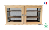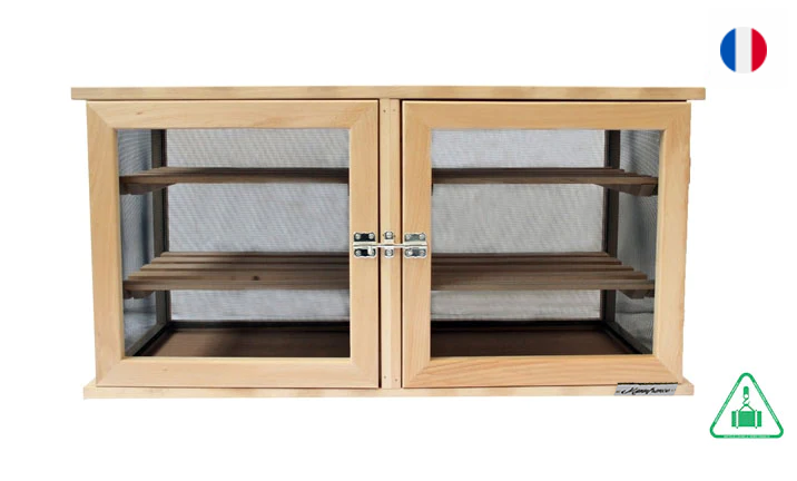 Caractéristiques : bâti en hêtre (la section est de 18 x 18 mm), grillagé sur 4 faces, toile moustiquaire en fil d'acier galvanisé puis plastifié (grande solidité, ne rouille pas), Fil de 0,236 mm et maille de 1,5 mm, 3 étages de chaque côté, 4 clayettes amovibles fournies, 2 portes équipées de targettes