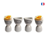 Fabriqué 100% en France, ils sont en grès et fabriqués à la main. Le grès est un matériau qui offre une résistance et une durabilité accrue. Le coquetier en grès est souvent apprécié pour son aspect rustique et naturel, ajoutant une touche de charme à votre table. Sa texture rugueuse et sa couleur blanche en font un objet esthétiquement agréable, permettant de s'harmoniser facilement avec n'importe quelle table ou vaisselle.