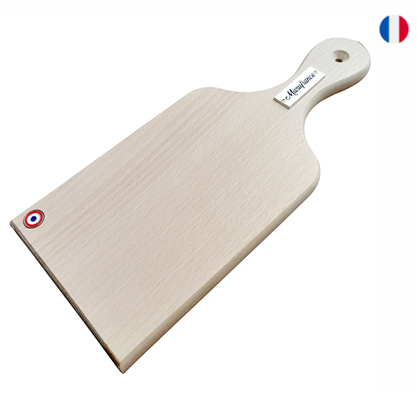 Conseil d'entretien : frottez la planche avec un tissu imbibé d'huile alimentaire avant la première utilisation pour le protéger des tâches. Par la suite, lavez avec un peu d'eau savonneuse puis laisser sécher à l'air libre. Ne passe pas au lave vaisselle. Fabrication artisanale de très grande qualité, soignée et 100 % française. Certification Origine France Garantie.