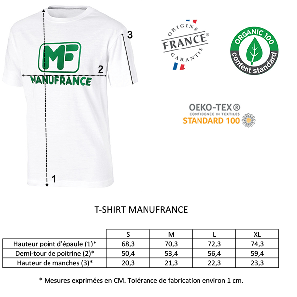 L'iconique logo Manufrance des années 1970 ! Fabrication française, 100 % coton biologique, Jersey 160gr, un T-shirt Manufrance de qualité fait pour durer lavage après lavage. Disponible en 3 coloris (logo vert, noir ou rose). Le T-shirt Manufrance est fièrement fabriqué en France : tricotage, teinture, confection et étiquette. Il le revendique avec la présence subtile en bas à gauche d'une étiquette tricolore représentant le drapeau français bleu-blanc-rouge. A ce titre il est labellisé Origine France Garantie. Le T-shirt Manufrance est 100 % fabriqué en coton biologique dans une démarche éco-responsable et environnementale avec la double certification Oeko-Tex et OCS 100 (cf. Savoir-faire). Disponible en taille S,M,L et XL. Nos T-shirts Manufrance taillent normalement. Coupe droite.