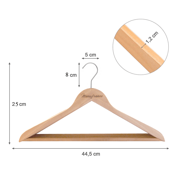 Cintre Manufrance, pour un esprit Vintage de fabrication française. Fabriqué en bois, polissage raffiné - Grâce à la haute densité de ce type de bois, les cintres ont une bonne capacité de charge et sont robustes. la surface est lisse et sans échardes. Crochet robuste, pivotant à 360° - Le crochet est robuste, durable, il vous permet d’accrocher et d’enlever les vêtements facilement Antiglisse - Grâce à la barre horizontale antiglisse, les vêtements ne tombent pas. Idéal pour les pantalons, les jupes, etc. Rangement parfait -Accrochez des vêtements par catégorie, vous ne fouillerez plus dans vos vêtements entassés. Les vêtements correctement accrochés ne se froissent pas, vous économisez du temps de repassage.