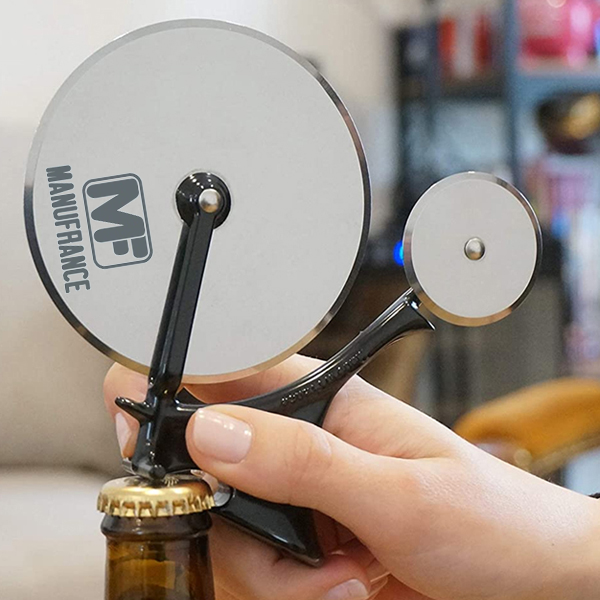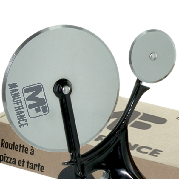 La solution ultime pour découper pizzas, tartes, flammekueches ... Une roulette à double lame, une grande pour découper et une petite pour couper la croûte, le trottoir ou les rebords dans les coins. En prime un décapsuleur ! Le tout éco-responsable, conçu et fabriqué en France évidemment ! Avec sa forme singulière qui n'est pas sans rappeler les vélos d'antan (les fameux Grand-Bi Manufrance) cette roulette à pizza à double lame circulaire aiguisée est conçu et pensé non seulement pour découper les pizzas mais aussi aux les quiches, flammekueches, lasagnes, sandwichs, gâteaux... La grande lame en inox alimentaire (Diamètre 90 mm.) est parfaite pour découper des parts généreuses et la petite lame (Diamètre 40 mm.) idéale pour couper la croûte fine ou épaisse, croustillante ou moelleuse dans les coins des plats ! Cerise sur le gâteau la roulette à pizza Manufrance est aussi équipé d'un décapsuleur intégré pour accompagner vos repas sans vous déshydrater ! Prise en main excellente grâce à sa "selle" ergonomique. Se pose à plat sur une table roulettes en l'air pour évitez miettes et salissures. Conception et fabrication 100 % française. Utilisation de matériaux en partie recyclés, recyclables, sans plastique et inoxydable faisant de son passage au lave vaisselle une simple formalité. Avec ses dimensions (17,5x3,5x13,5 cm. ) il trouvera facilement sa place dans un tiroir pour toujours demeurer à portée de main ! Livré dans sa boîte en carton style boite à pizza !