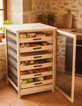 Speisekammer in Maxi-Version zur Lagerung von Obst und Gemüse im Winter. Dank Ihrer Vorratskammer können Sie im Herbst Ihr Obst und Gemüse kaufen und es anschließend trocken und lichtgeschützt lagern. In den Schubladen können Sie Obst und Gemüse, Knoblauch, Zwiebeln oder Kartoffeln organisieren. Es verfügt über 3 herausnehmbare Schubladen. Möglichkeit, insgesamt 6 Schubladen unterzubringen. Es ist auch möglich, zwischen den Schubladen eine „Spezialkartoffel“-Schublade hinzuzufügen (Achten Sie darauf, dass diese höher ist als die anderen). Alle Schubladen sind als Ersatzteile auf unserer Website erhältlich.