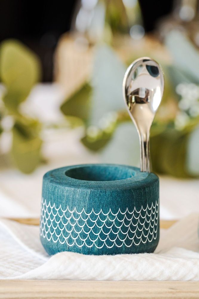 Coquetier en bois avec petite cuillère.