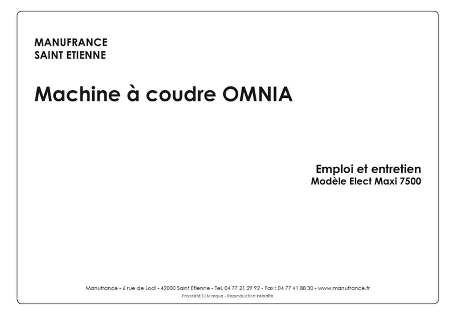 Gebrauchs- und Wartungsanleitung für die Nähmaschinenmodelle OMNIA Electric Maxi 7500. Dokument erstellt nach dem Original. Diese Mitteilung ist in digitaler Version zum Öffnen mit Adobe Reader-Software (PDF-Format) oder in Papierversion verfügbar. Für die Papierversion erhalten Sie die Mitteilung per Post. Für die digitale Version erhalten Sie die Datei an Ihre E-Mail-Adresse.