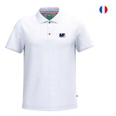 Détails : Logo discret MF brodé, col renforcé, patte de boutonnage avec boutons bleu blanc et rouge en biorésine.