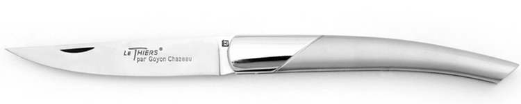 Das Vollgriff-Taschenmesser Le Thiers von Manufrance ist ein echter Lebenspartner. Die Edelstahlversion ist mit glänzendem oder sandgestrahltem Griff erhältlich. Dieses von Hand zusammengebaute und fertiggestellte Klappmesser aus Sandvick-Stahl bietet die nötige Stabilität für alle alltäglichen Anwendungen. Das Verschlussmesser von Le Thiers erfüllt alle Anforderungen an Herstellung, Authentizität, Rückverfolgbarkeit und Territorialität, die in der Charta der Bruderschaft des Thiers-Messers, Garant für den Schutz der Marke, vorgeschrieben sind. 100 % französische und handwerkliche Herstellung. - Gehärteter Edelstahl 12C27 - Entablage - Doppelschliff - Zwangskerbe - Glatte geschmiedete Feder - Montage mit 3 Vliesnieten. Verkauft im Karton mit schwarzem Kunstlederbeutel.