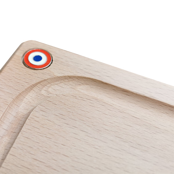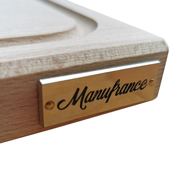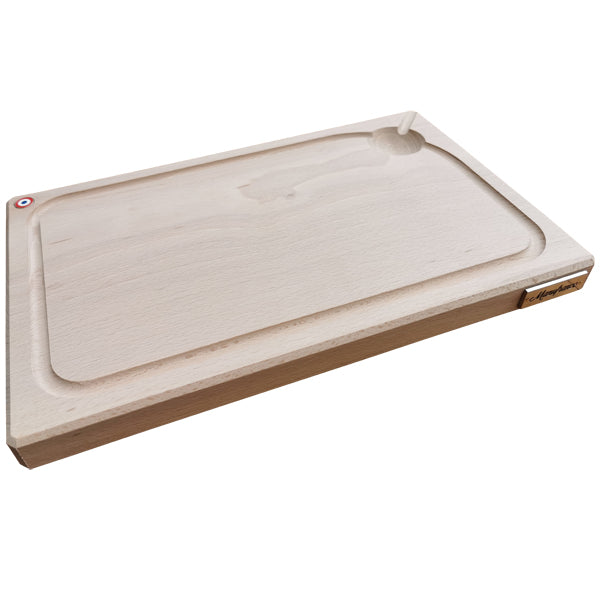 A Manufrance meat cutting board with a groove and a pocket to collect juices. A wooden board ideal for cutting your finest cuts of meat. It is made of beech, a strong and robust wood that preserves the sharpness of knife blades. The end of the Manufrance meat board is waxed to prevent moisture from penetrating the wood grain. It can also be used as a presentation board, an appetizer board, or a serving board. Available in two sizes: 35x22cm or 40x28cm. Care instructions: Rub the board with a cloth soaked in cooking oil before first use to protect it from stains. Afterward, wash with a little soapy water and let it air dry. Not dishwasher safe. Very high-quality, careful, and 100% French artisanal manufacturing. Certified French Origin Guaranteed.