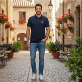 Détails : Logo discret MF brodé, col renforcé, patte de boutonnage avec boutons bleu blanc et rouge en biorésine.